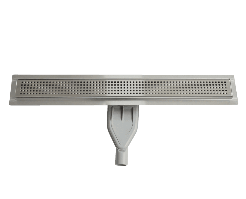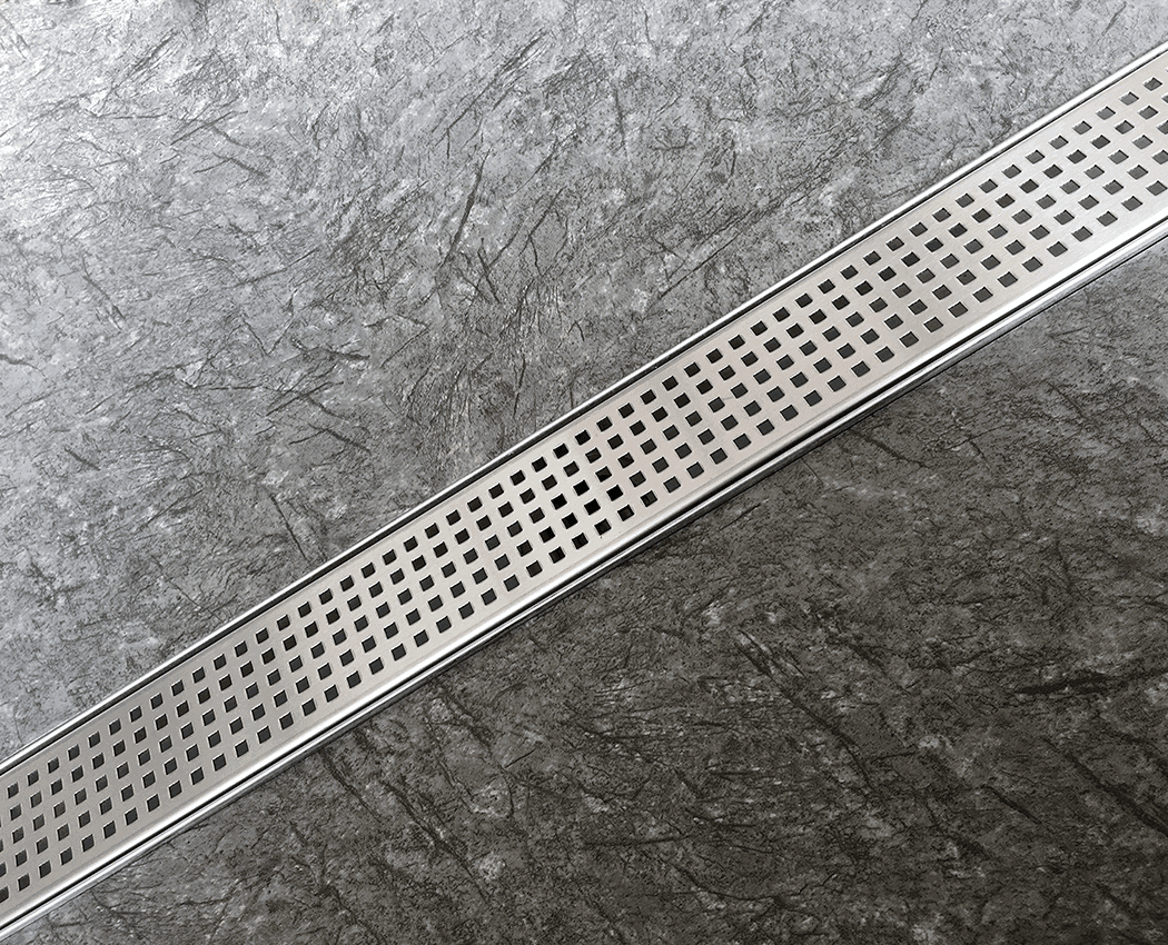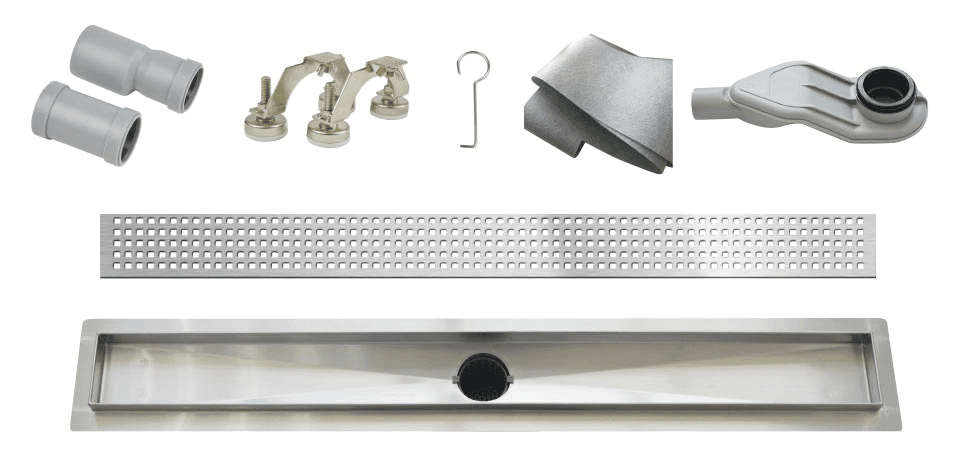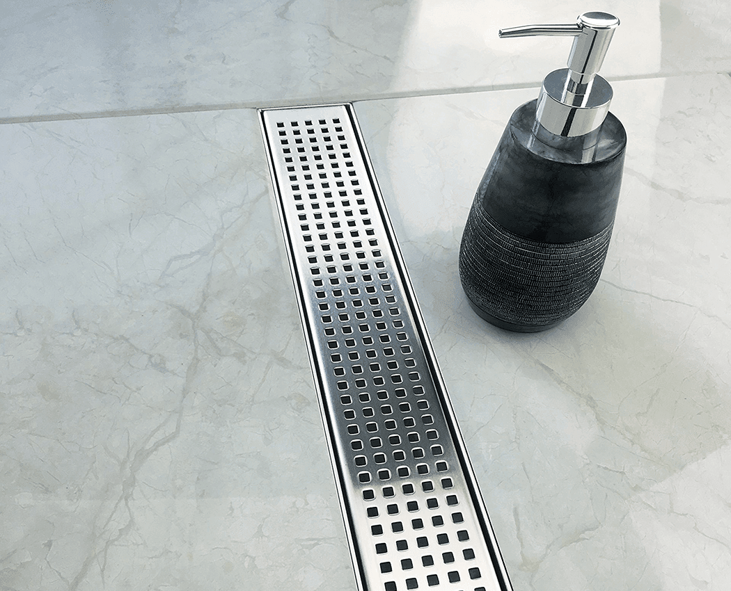 W-Drain premium stainless steel shower drain set, with Wavy grille pattern, in various sizes.
